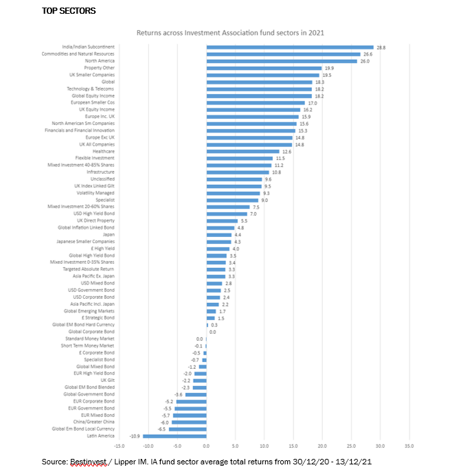 However, while tech and other growth stocks did indeed come under pressure in the earlier part of 2021, North America has ended up as the third-strongest performing Investment Association sector in 2021 with total returns of 26.0%.